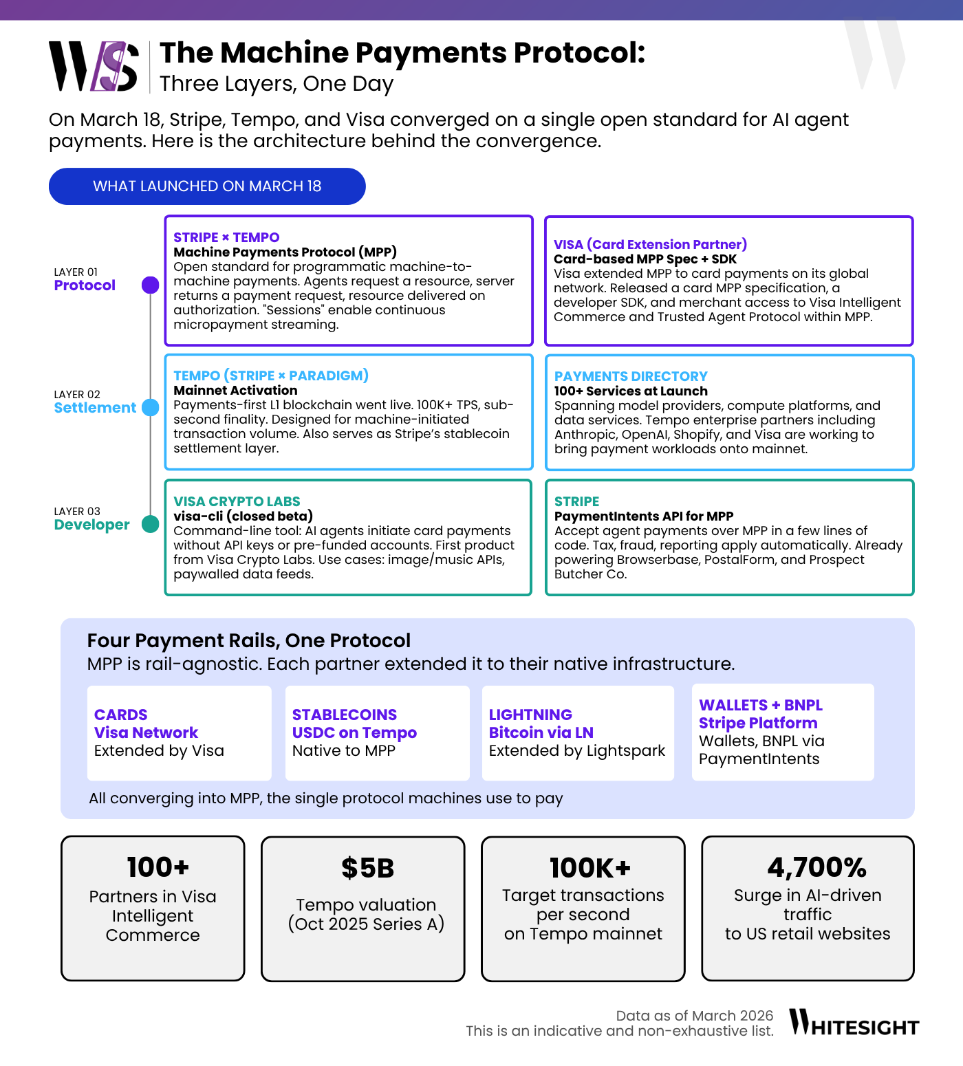 On March 18, Stripe and Tempo launched the Machine Payments Protocol (MPP). This open standard defines how AI agents request, authorize, and settle payments with services programmatically. Tempo, the payments-focused blockchain incubated by Stripe and Paradigm, activated its mainnet on the same day. Visa, a design partner on MPP, simultaneously extended the protocol to support card-based payments across its global network.