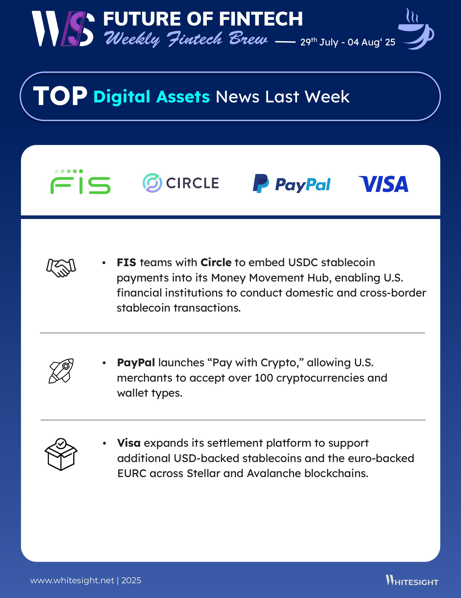 The card network giants are no longer sitting on the crypto sidelines. From stablecoins to tokenized assets, they're rewriting their rulebooks to stay ahead in a world of digital value. This week’s featured infographic from WhiteSight dives into the evolving digital asset playbooks of Visa and Mastercard - and what they signal for the future of finance.