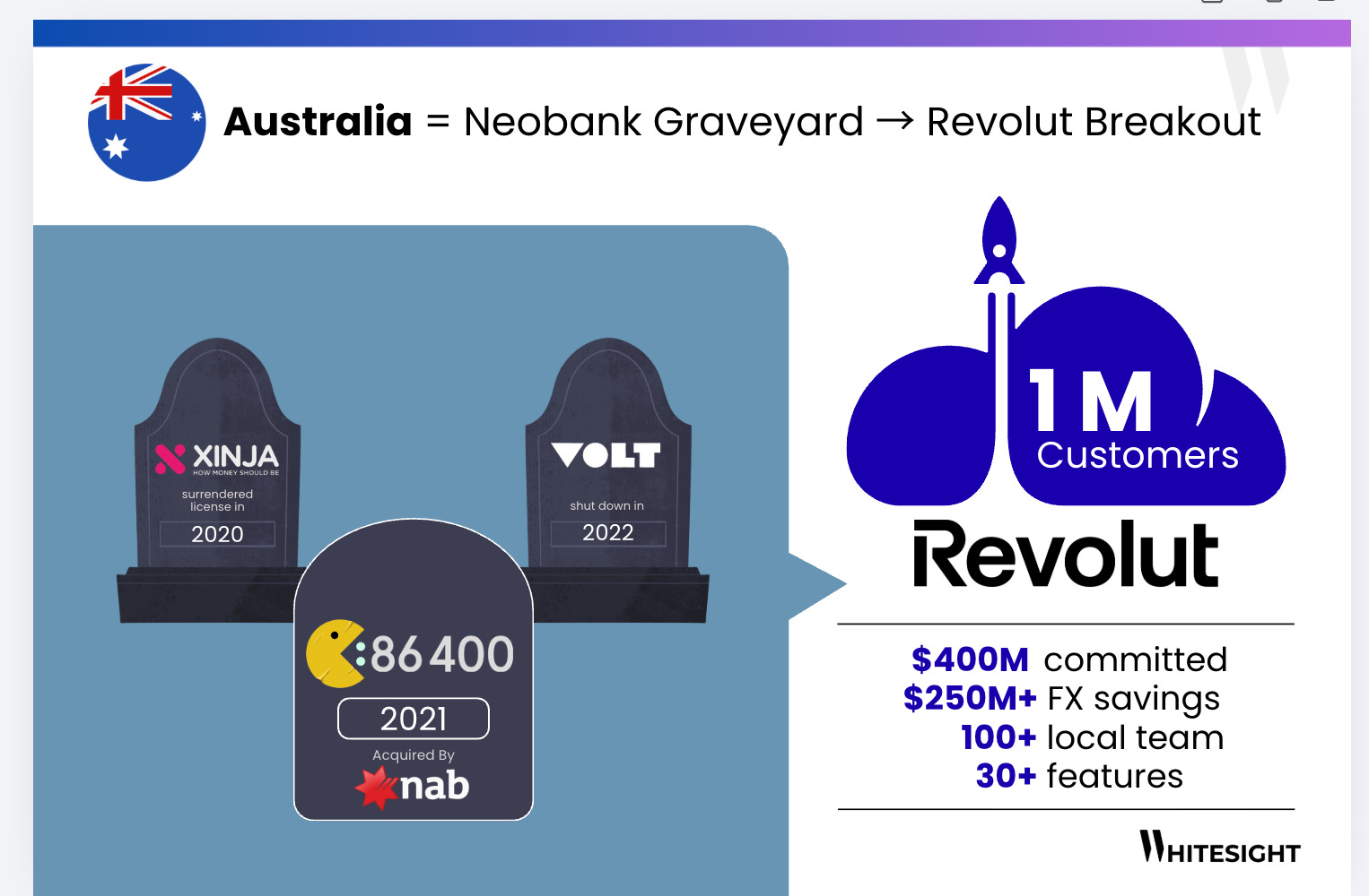 Revolut crossed 1 million retail customers in Australia and plans to invest nearly $400M over the next five years. That stands out in a market where several local neobanks struggled to reach sustainable scale, with some exiting or being absorbed after funding and regulatory pressure.