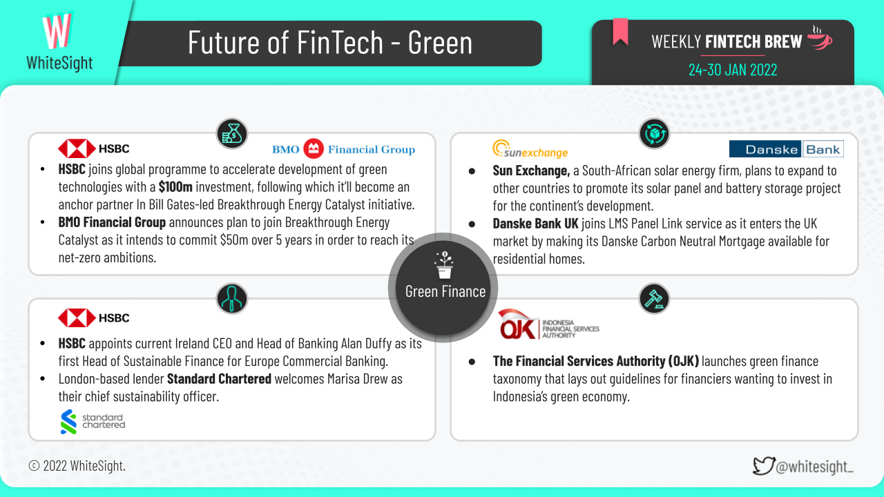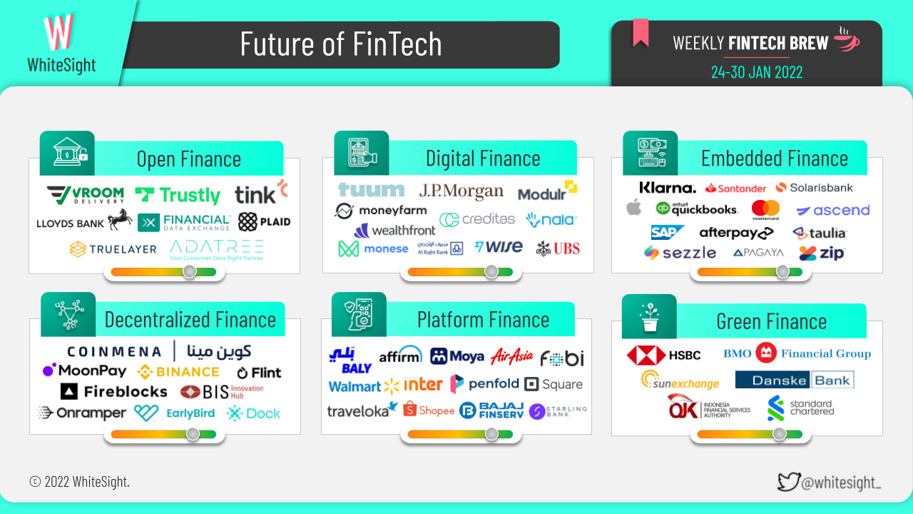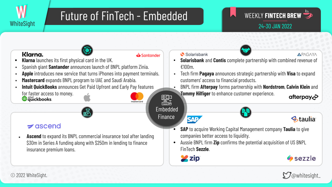 As the last week of January bids us adieu to welcome the newness of spring, it leaves no stone unturned in serving us the hot tea surrounding the FinTech world. In a close race for the theme that takes the crown this time around, Embedded Finance takes the lead from Digital Finance by just a mark. The buzz around DeFi and Platform Finance also made up for a good round of announcements. While the Open Finance and Green Finance spheres stayed comparatively low-key, their stir was enough to recharge the Weekly FinTech Brew’s refill for the week.