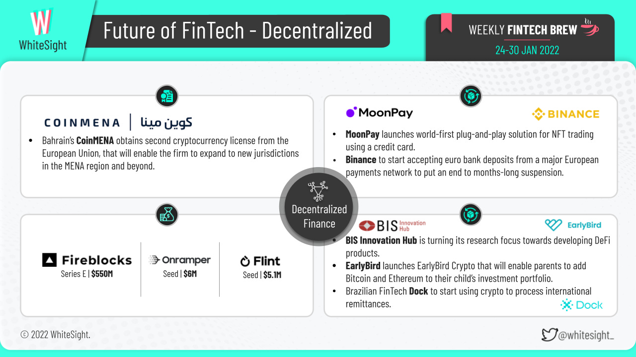 Many crypto platforms were the receivers of significant funding amounts for the week – with crypto investment platform Flint raising $5.1m seed led by Sequoia Capital India and GFC; fiat-to-crypto gateway aggregator Onramper securing $6m in seed funding led by EQT Ventures; and crypto custody platform Fireblocks’ latest $550m Series E funding round, that now values the infrastructure provider at a booming $8bn valuation. At the same time, Bahrain’s crypto assets exchange CoinMENA obtained a second cryptocurrency license from the European Union that will help it strengthen banking relationships with regional as well as global banks.