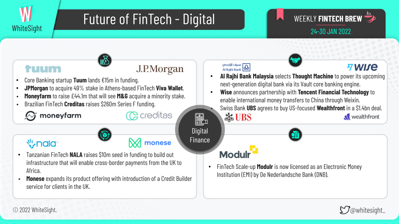 While JPMorgan agreed to take around 49% stake in cloud-based Viva Wallet for continued payments innovation in the European businesses, digital wealth manager Moneyfarm raised £44.1m through a private placement led by M&G, allowing the latter to acquire a minority stake in the company. Estonian core banking supplier Tuum also landed a €15m funding deal to expand its operations initially in the UK, followed by R&D efforts to develop its product portfolio. Brazilian FinTech Creditas jumped the funding bandwagon with its own $260m Series F funding valuing the company at $4.8bn.