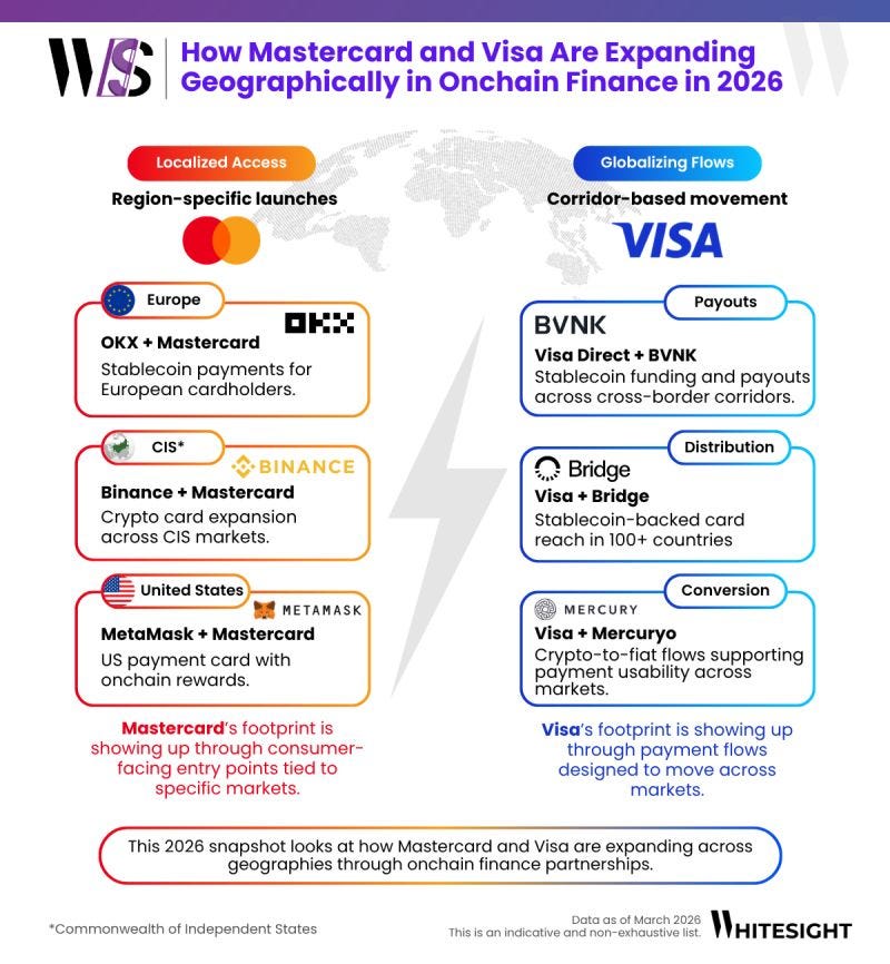 Beyond Mastercard’s acquisition of BVNK - which grabbed massive headlines - another story is what both payment giants have been quietly building across markets. So far in 2026, Mastercard is doubling down on localized access through regional partners, while Visa is scaling cross-border payment flows through infrastructure. It’s two very different strategies for owning onchain finance.